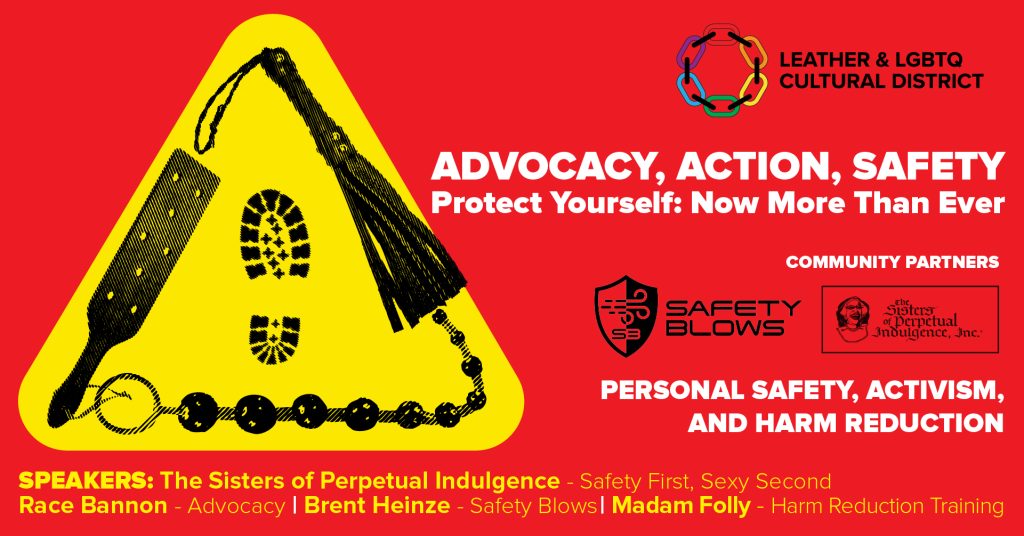 We are collaborating with Race Bannon, Brent Heinze of Safety Blows, The Sisters of Perpetual Indulgence and Ms. SF Leather Madam Folly to address issues that have recently become critical to our communities in these uncertain times. Now is a time that we need to band together to protect ourselves and each other.