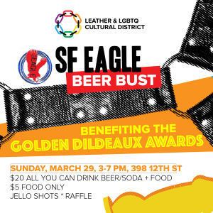Join us Sunday, March 29, for the LEATHER & LGBTQ Cultural District’s Golden Dildeaux’s beer bust! This will be an opportunity to cast your votes before voting closes on April 8th.