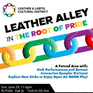 This Sunday, June 29, visit our Leather Alley! which is an entire block on Polk St. (enter at Golden Gate Ave.) inside the adults (18+) only area called ‘the Root of Pride’.