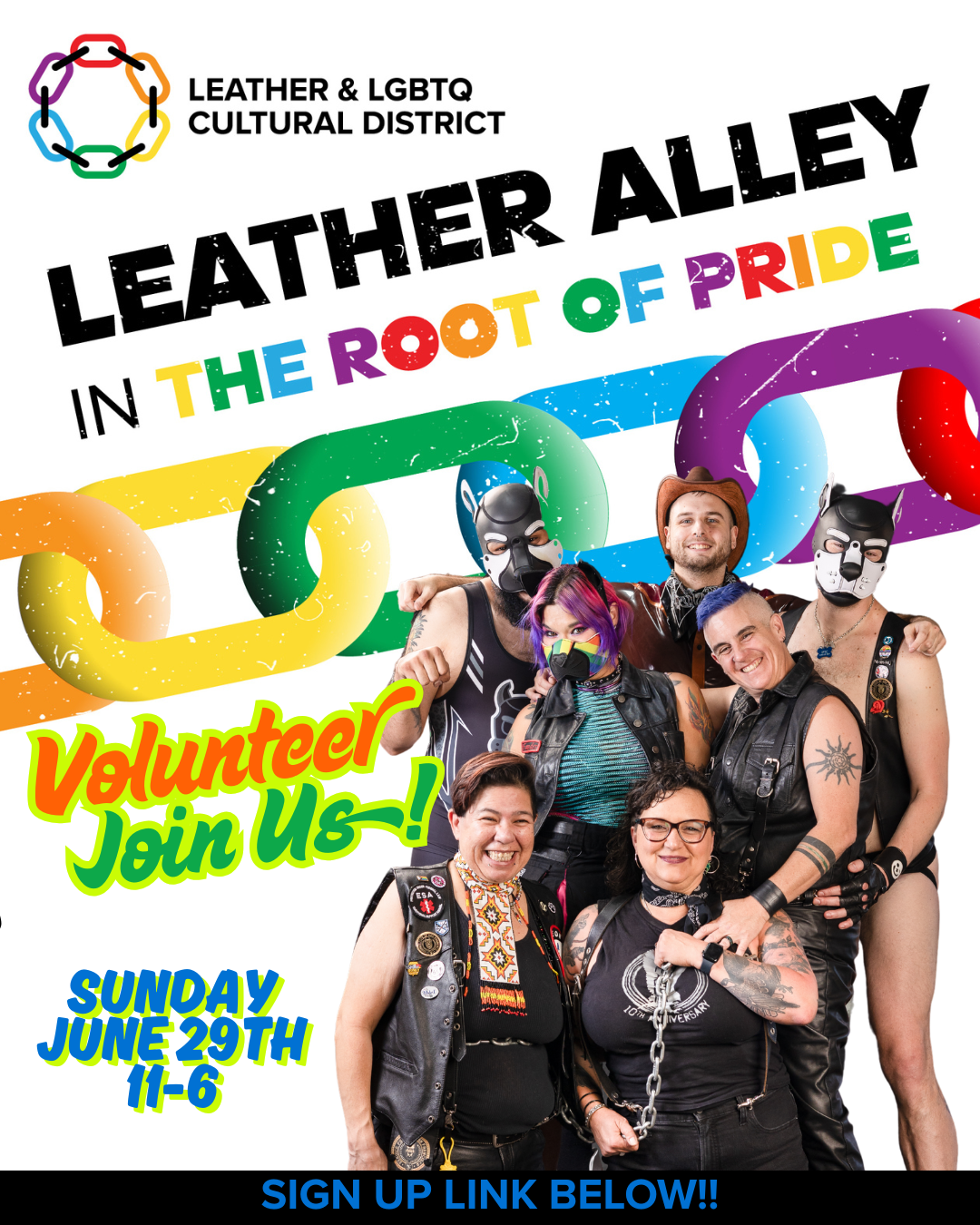The LEATHER & LGBTQ Cultural District will be proudly hosting LEATHER ALLEY at San Francisco’s 2025 Pride Celebration and we will be marching in the Pride Parade, join us!